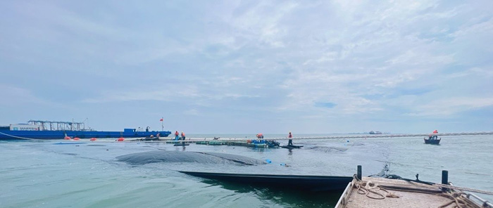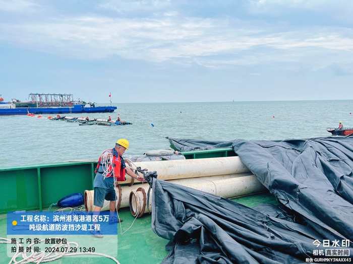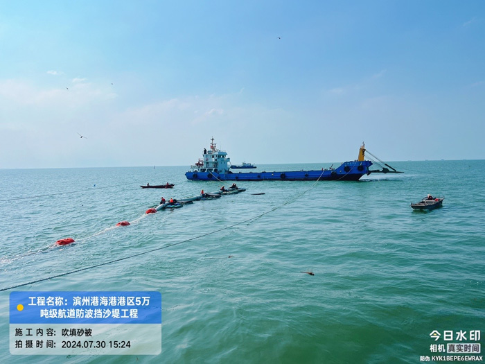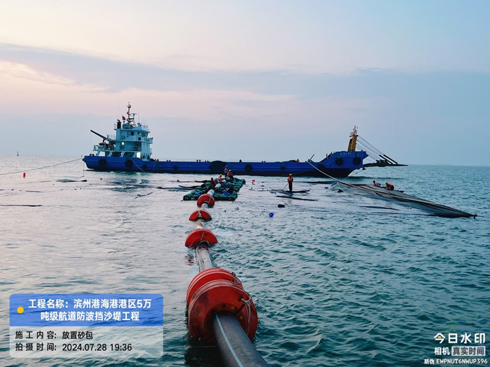 本工程位于山東省濱州市無(wú)棣縣濱州港區(qū),擬建的水工建筑物主要包括新建東西兩條防波擋砂堤,單堤長(zhǎng)度8800m,總長(zhǎng)17.6km。我司主要參建內(nèi)容:負(fù)責(zé)東堤1800米砂被吹填、土工布及土工格柵施工,里程為K2+200~K4+000。